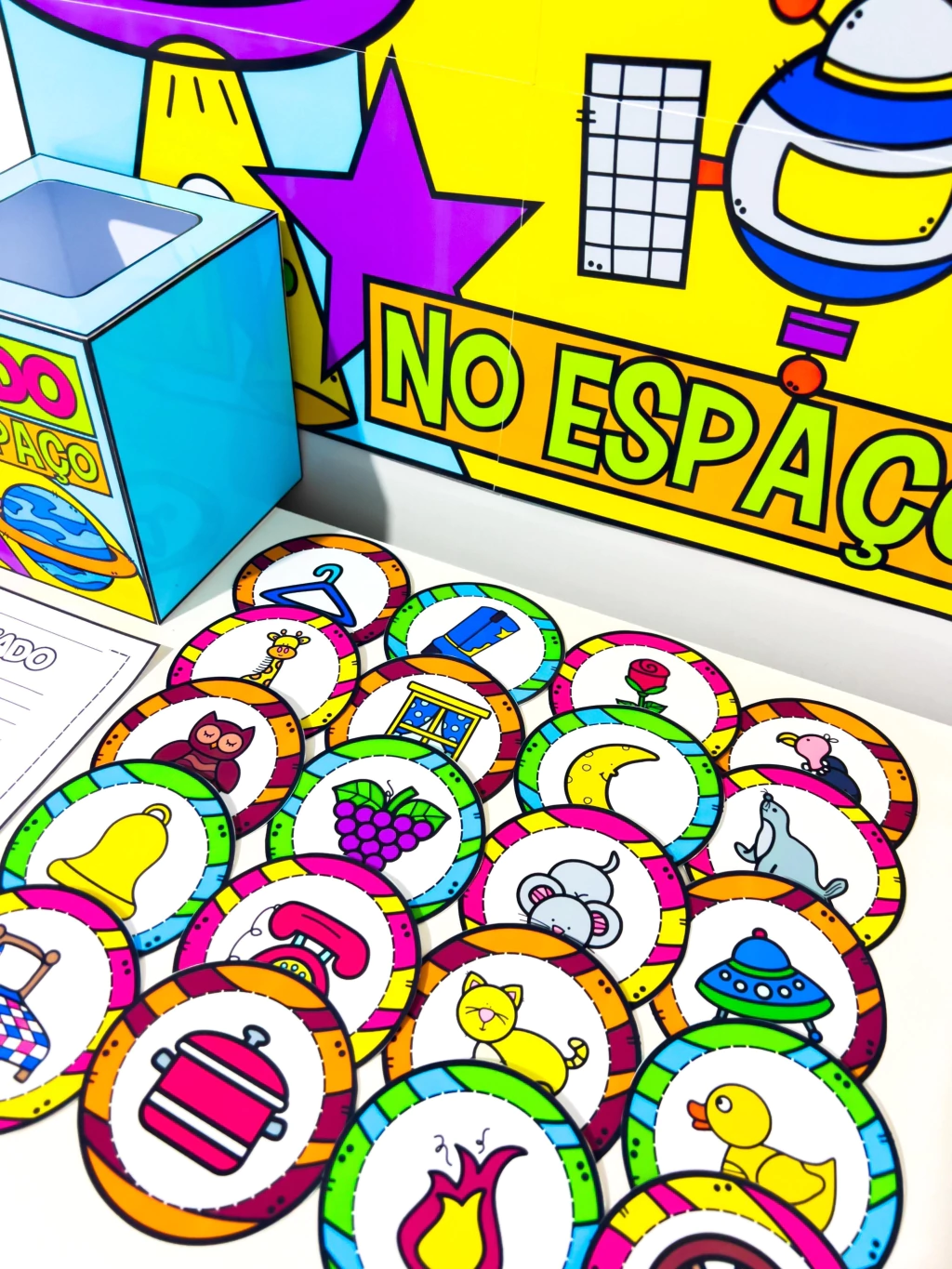 Ditado no Espaço é um recurso lúdico e envolvente que transforma o momento do ditado em uma verdadeira aventura intergaláctica! O material acompanha 36 fichas ilustradas com palavras de sílabas simples, uma folhinha para as crianças registrarem as palavras sorteadas, um painel em 4 partes cheio de cores e elementos do espaço e um molde de caixa para armazenamento.