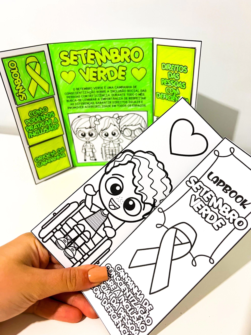 Esse material da imagem é um lapbook sobre o Setembro Verde, criado com o objetivo de trabalhar a conscientização e a inclusão das pessoas com deficiência.