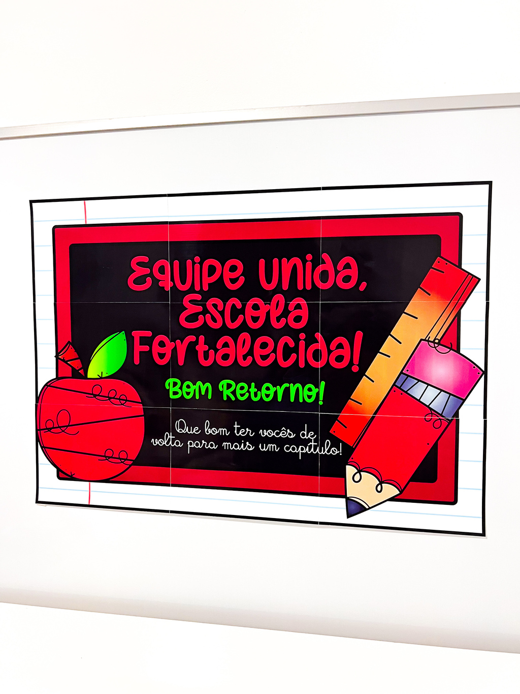 Esse material pedagógico é um painel de boas-vindas chamado "Painel Retorno da Equipe", composto por 9 folhas A4 que, juntas, formam uma mensagem acolhedora e motivacional para o início do semestre. Com o tema escolar e visual vibrante, o painel traz ilustrações de lápis, régua e maçã, além da frase central: "Equipe unida, escola fortalecida! Bom retorno!"
