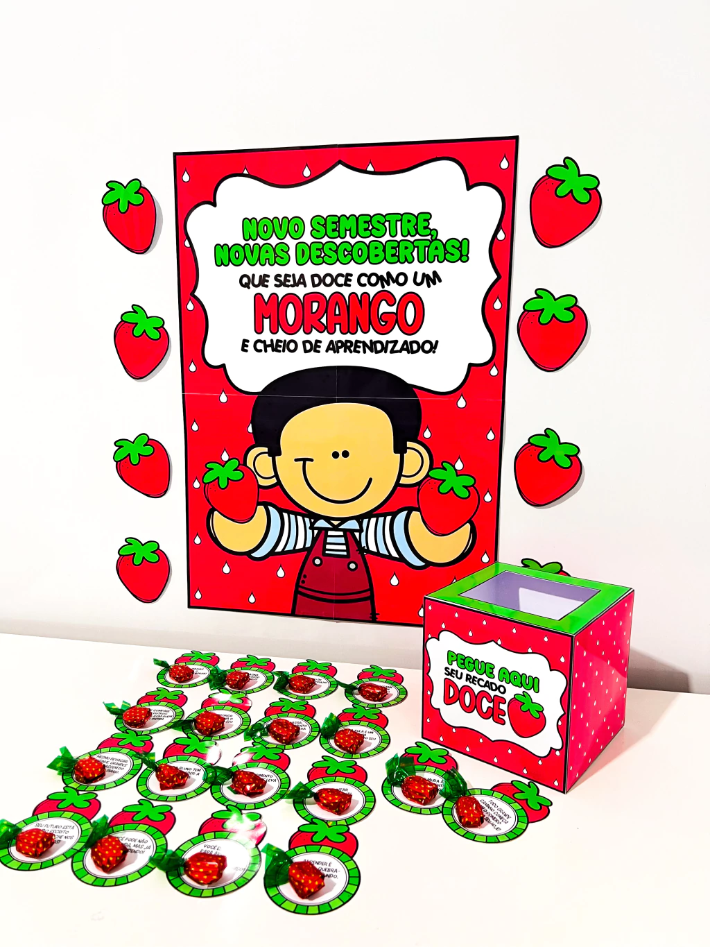 - 36 fichas motivacionais: cada ficha tem o formato decorativo com morango e traz uma frase inspiradora para os alunos, com espaço para colar uma balinha, tornando o momento ainda mais doce e significativo.